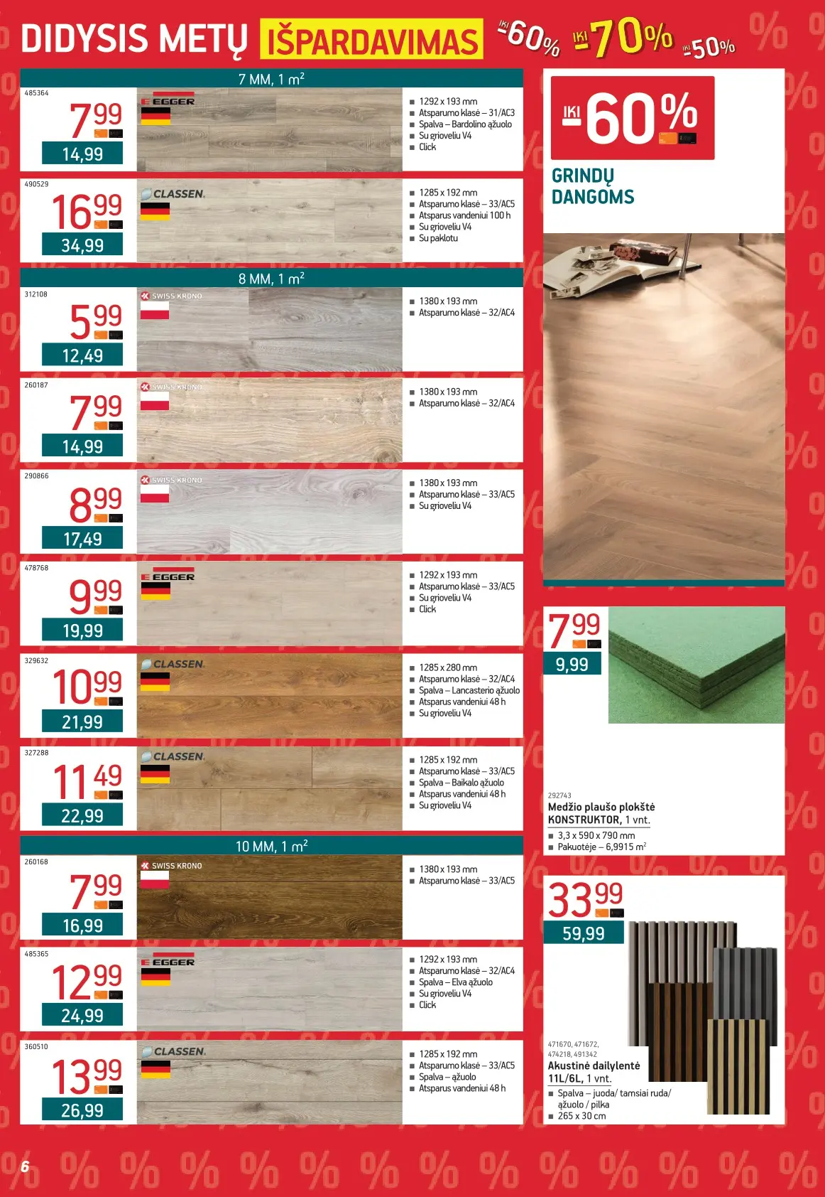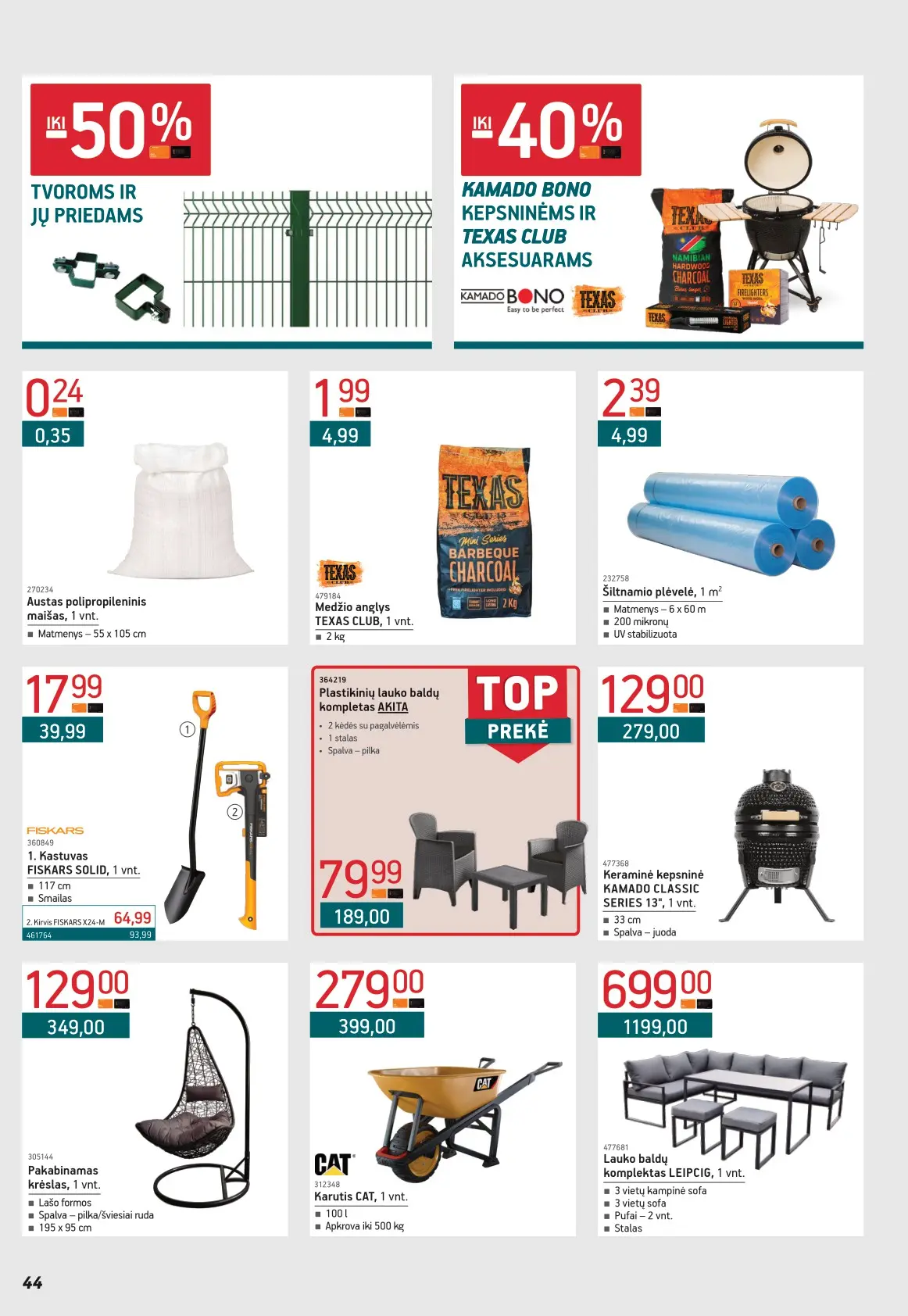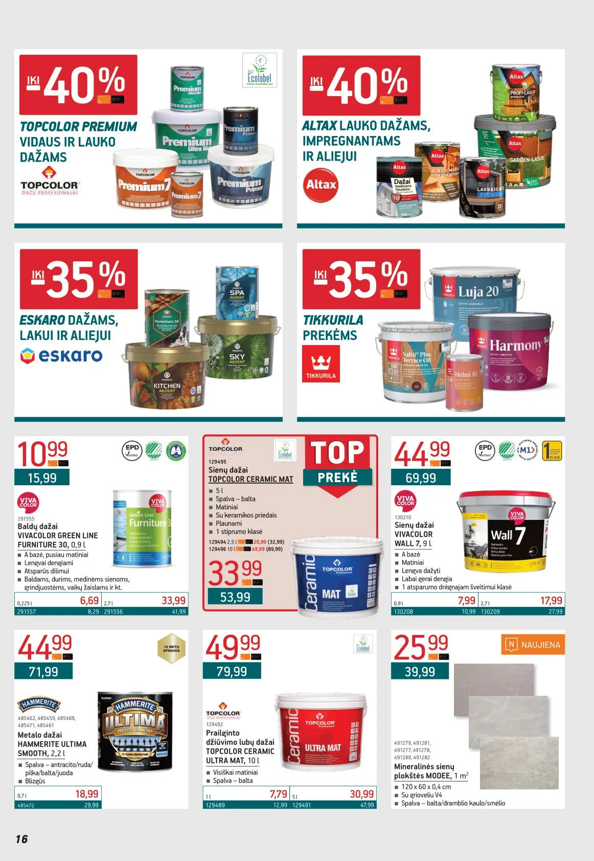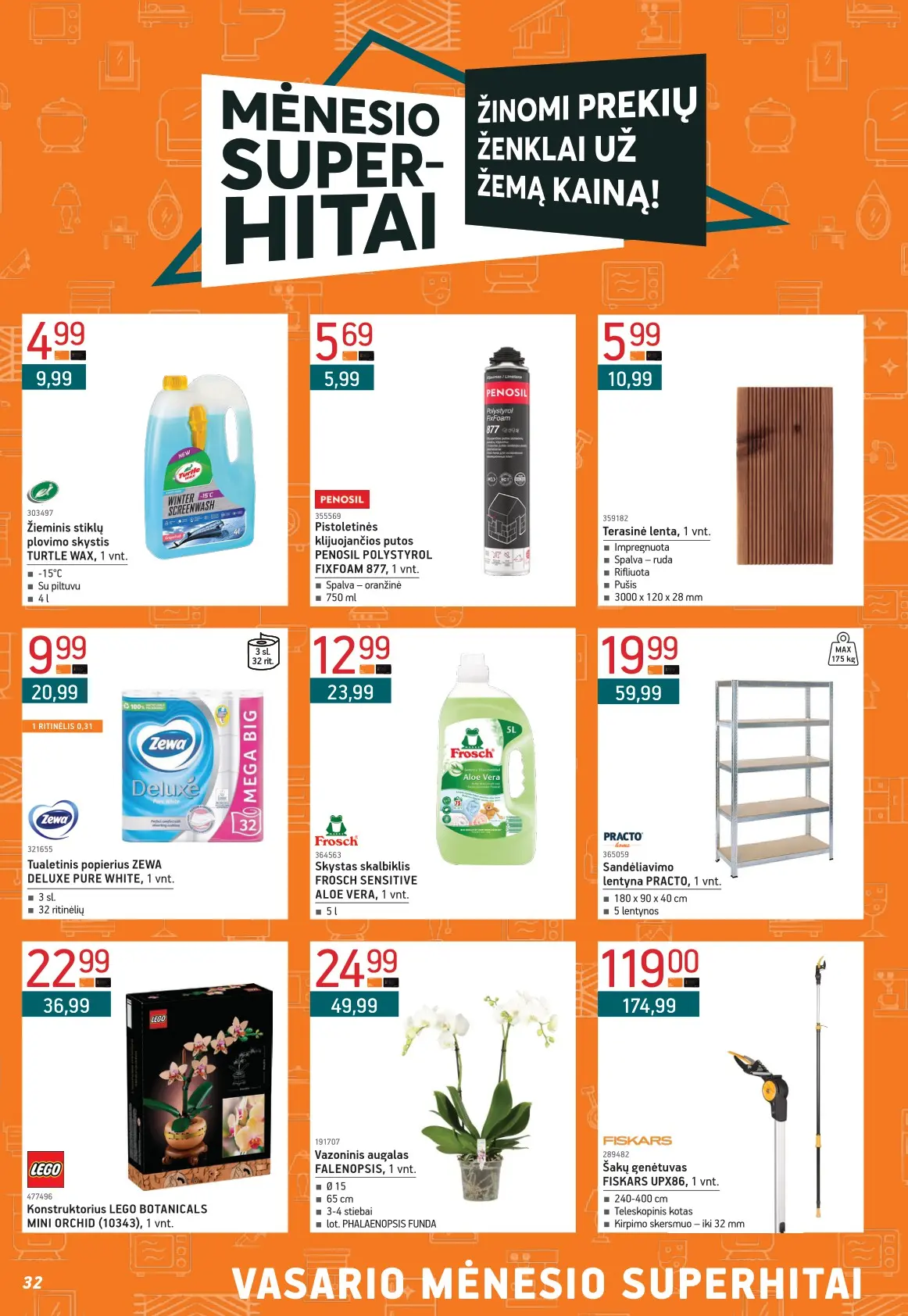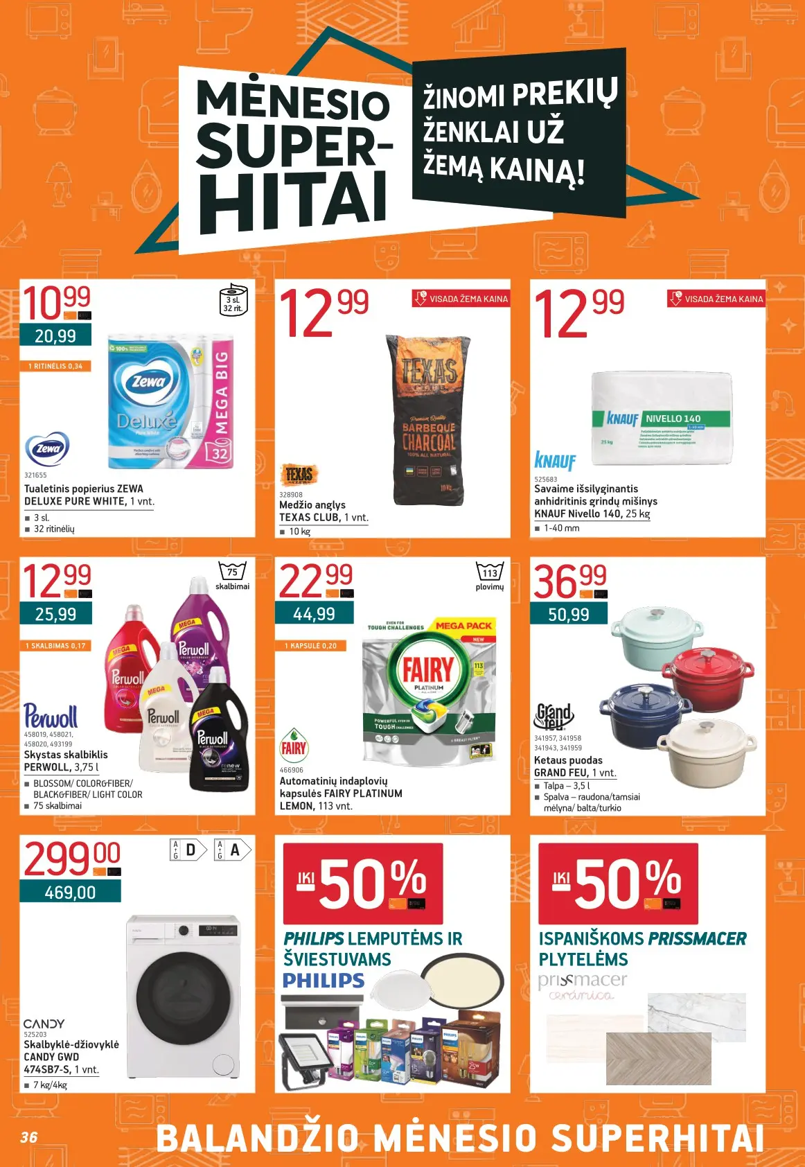 Leidinyje pateikiami pasiūlymai statybinėms medžiagoms, įrankiams, apdailos elementams, sodo ir laisvalaikio prekėms, buities reikmenims bei elektronikai. Čia rasite nuolaidas populiariausiems gamintojams ir prekių ženklams – nuo cemento iki šviestuvų, nuo grąžtų iki skalbimo mašinų.