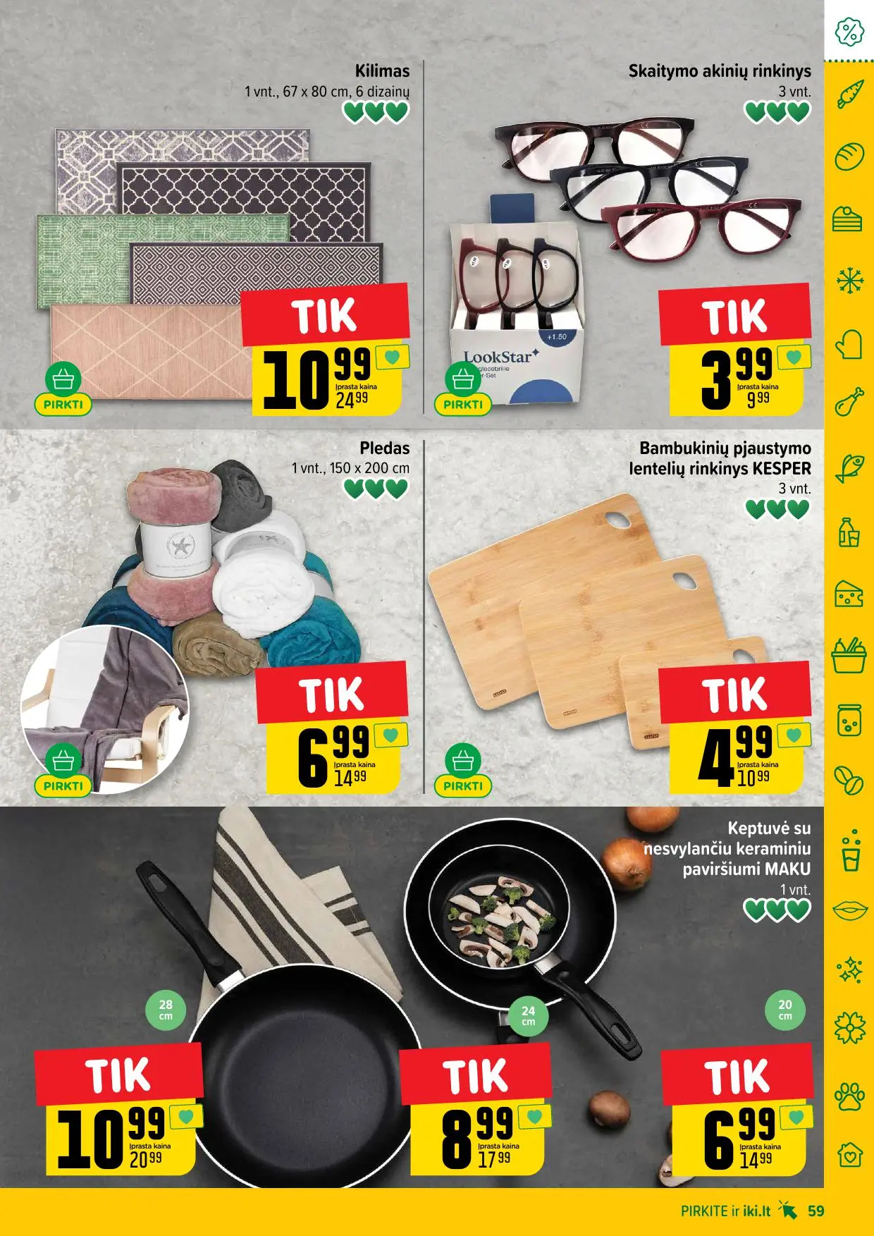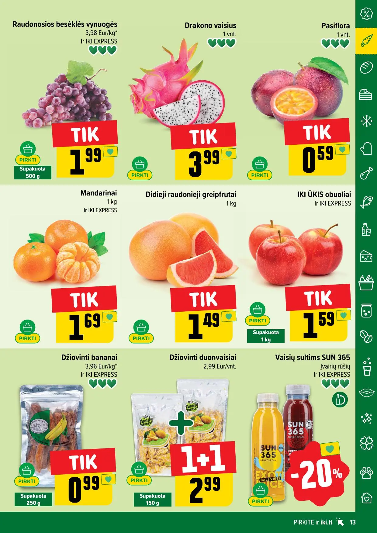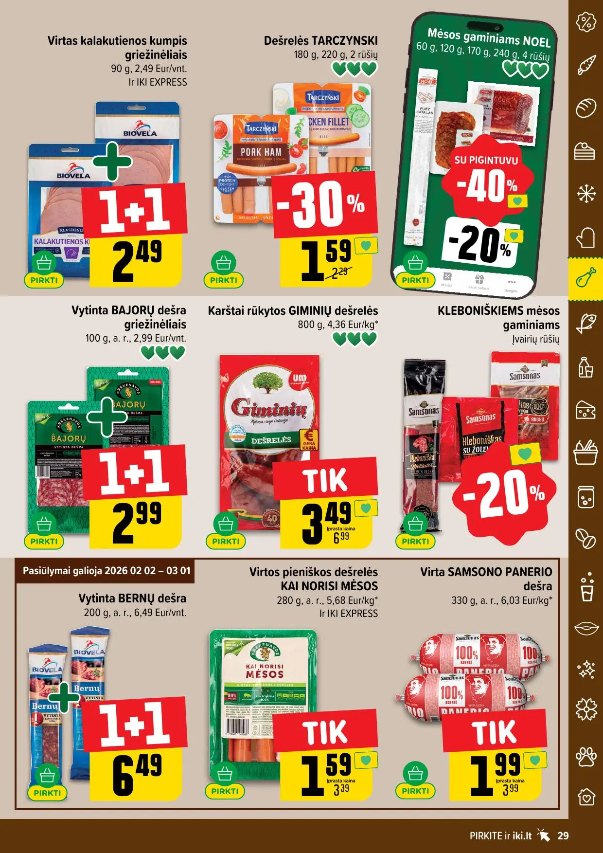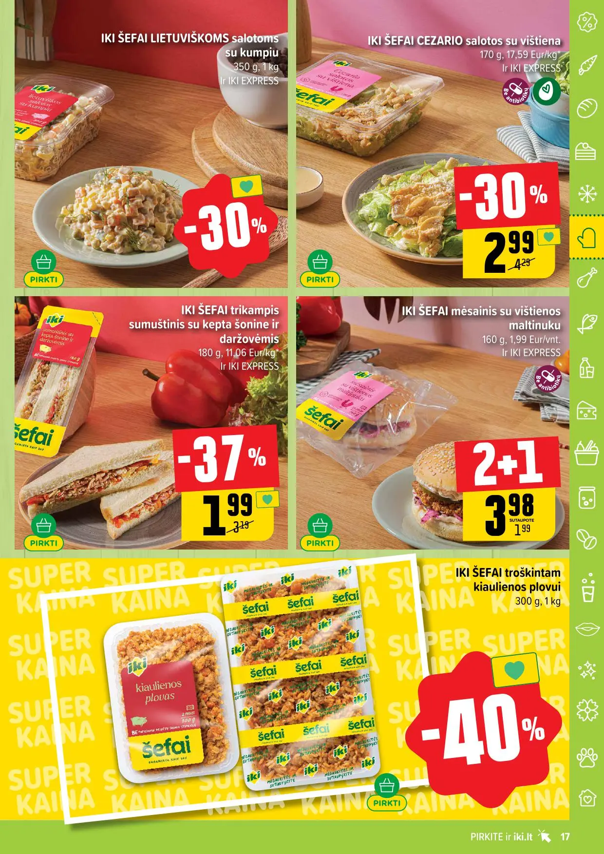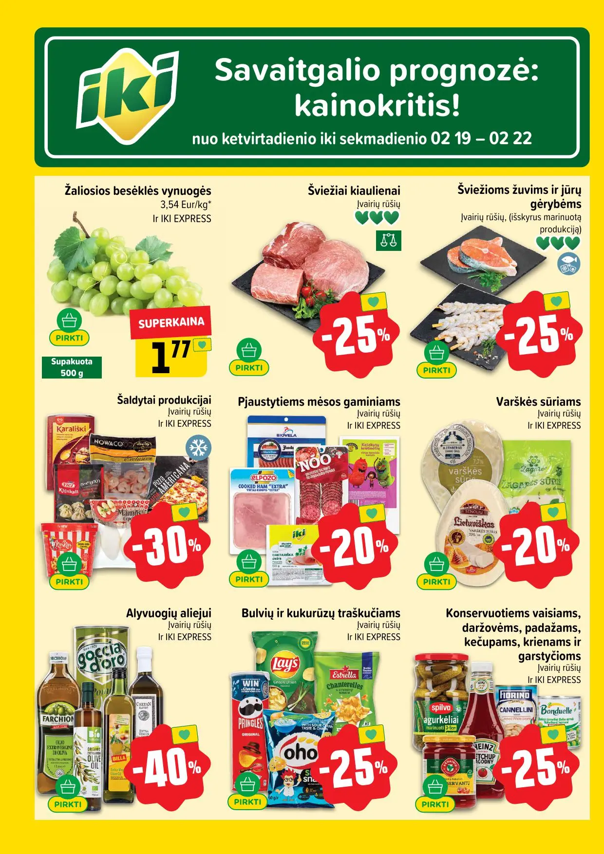 Leidinyje pateikiamos savaitės akcijos su didžiausiomis nuolaidomis: mėsai, pieno produktams, kepiniams, saldumynams, gėrimams, gyvūnų prekėms ir dar daugiau. Dauguma nuolaidų taikomos tik su IKI lojalumo kortele, tad nepamirškite jos pasiimti!